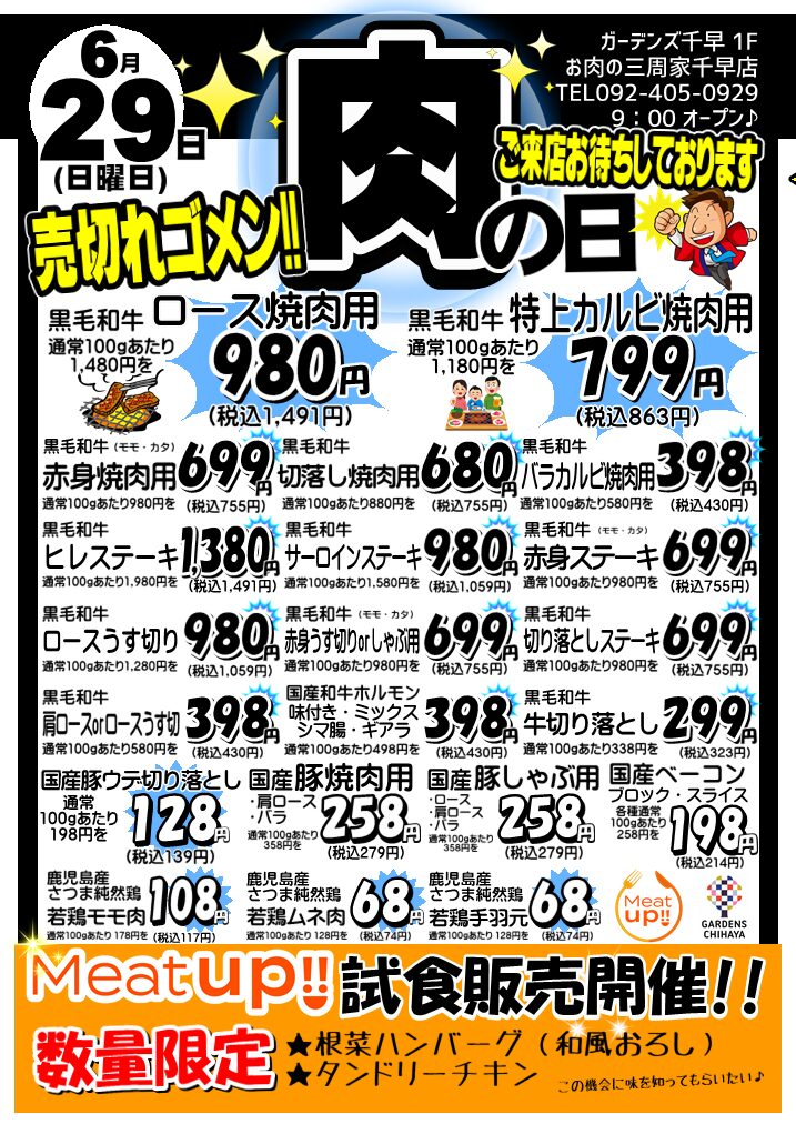\ ガーデンズ千早1F お肉の三周家  6月29日(日) 朝9時〜スタート!! /