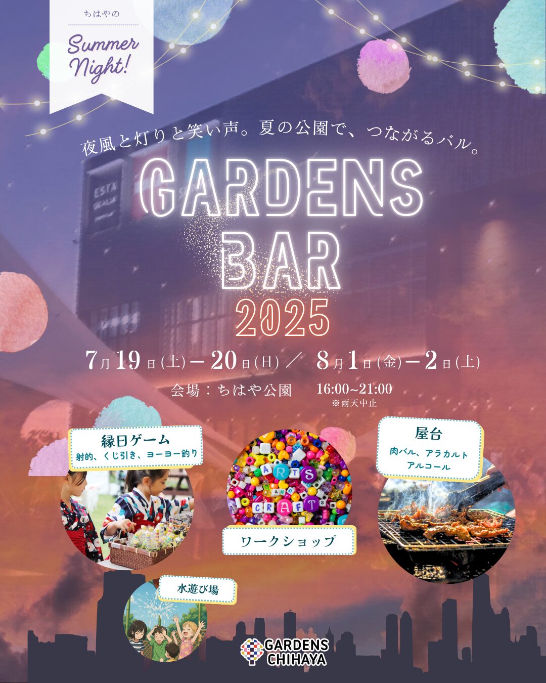 ガーデンズバル2025 開催日時:2025.7.19(土) 〜 8.2(土)/16:00〜21:00 開催場所:/ちはや公園 夏の夕暮れから始まる、ガーデンズバル2025を開催!真夏の日が沈む、ちはや公園で「食べたり・飲んだり」「縁日したり」「ワークショップしたり」「水遊びしたり」、夕涼みをしながら子供も大人も過ごせる夜のイベントを開催します。 開催日:2025年7月19日(土)・20日(日)/8月1日(金)・2日(土)時間:16時〜21時場所:ガーデンズ千早 ちはや公園 投稿ナビゲーション 夏休み!毎日チャレンジ スタンプラリー7月ちはやフードマルシェ