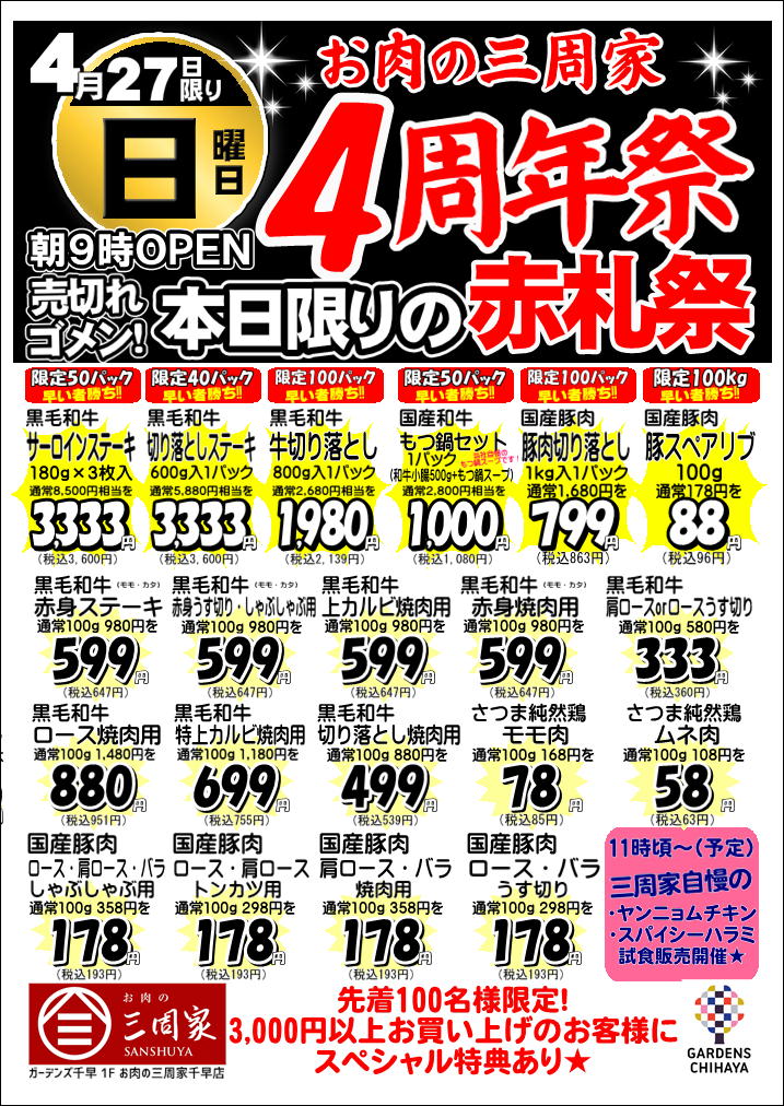 4/27(日)は一年で一番熱い!周年祭 2025.04.24 NEWS 黒毛和牛サーロインステーキが180g×3枚入“3333円”、黒毛和牛切り落としステーキが600g入“3333円”、 豚スペアリブ100gが“88円”! 他にも特価が盛りだくさん! まさかの破格大放出!!朝9時オープン、売り切れ御免!3,000円以上ご購入で(先着100名様)スペシャル特典もあり♪ 肉好き、チャンス逃すな!AM9:00スタート! お肉の三周家ガーデンズ千早本館1F 投稿ナビゲーション 5/5(月)は『戌の日』 \アカチャンホンポの5月のお得情報/