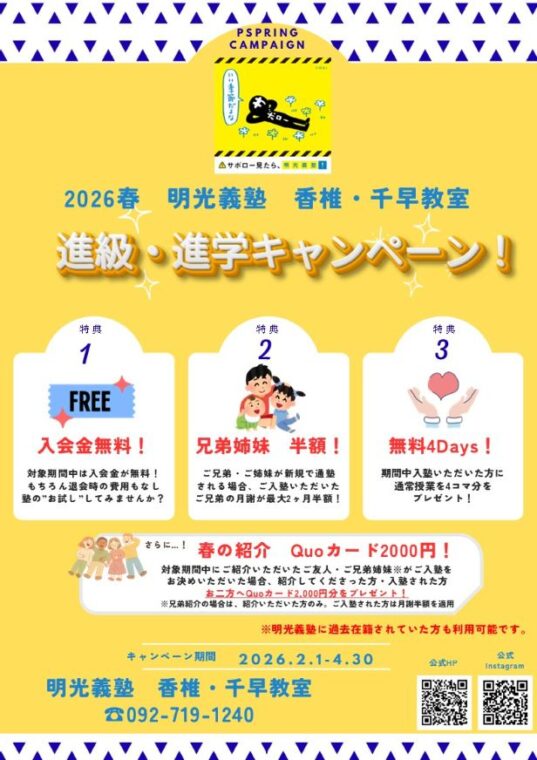 また、非受験生にとっても進級、進学を控えて、現学年の復習や新学年の予習を行うための大事な時期となっております。ぜひ、一緒に明光義塾で勉強を頑張って、春のスタートダッシュを切りましょう!!