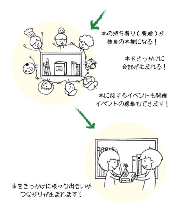 みなさんから思いのこもったおすすめの本を寄贈していただき、寄贈していただいた方のメッセージや、読まれた方が感想を書き連ねる『感想カード』を置いたりして人と出会い、つながりが生まれるライブラリーです。