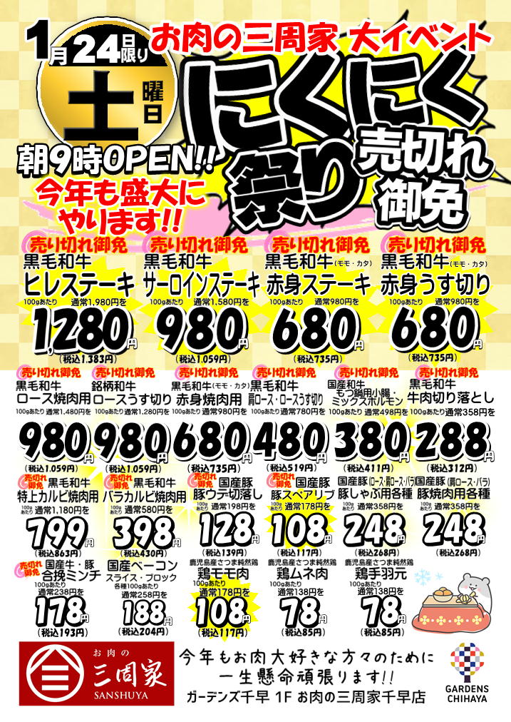 今月も【お肉の三周家】では、日頃のご愛顧に感謝を込めて、黒毛和牛を中心とした特別価格の「にくにく祭」を開催いたします。