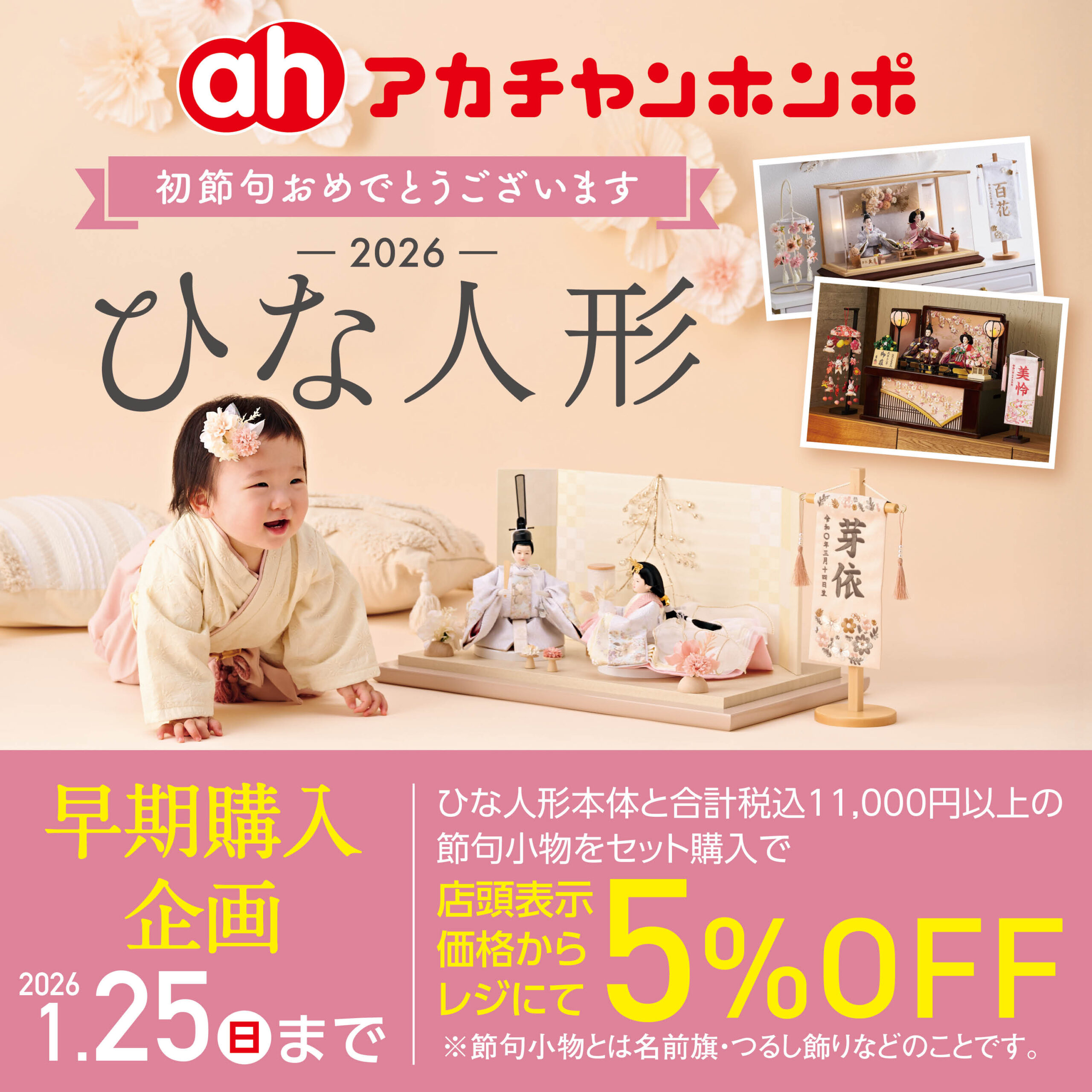 1/25(日)までの今なら、ひな人形本体と合計税込11,000円以上の節句小物をセット購入で、店頭表示価格からレジにて5%OFFの早期購入企画を開催中♪