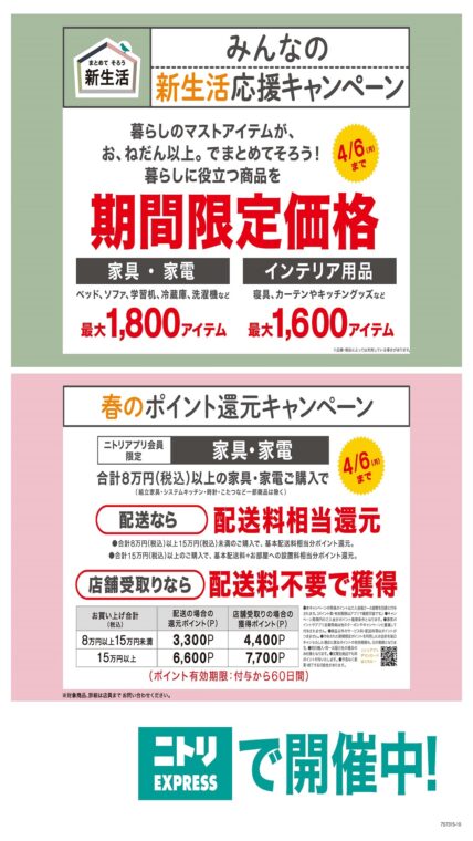 みんなの新生活応援キャンペーン 2026.02.20 NEWS|イースト館 新生活の家具・家電がお得に揃う「みんなの新生活応援キャンペーン」開催中! ニトリアプリ会員なら、税込8万円以上の一部商品を除く家具・家電購入で配送料相当のポイント還元実施中!是非このお得な機会にニトリへお越しください。 投稿ナビゲーション お肉好き必見の大イベント「にくにく祭」開催決定!メガネブランドZoff「創業25周年フェア」開催!