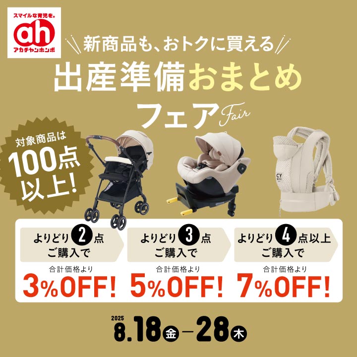 ベビーカー、チャイルドシート、抱っこ紐、ベビーラックなどの対象商品をよりどりでご購入いただくと、最大7%OFF◎
