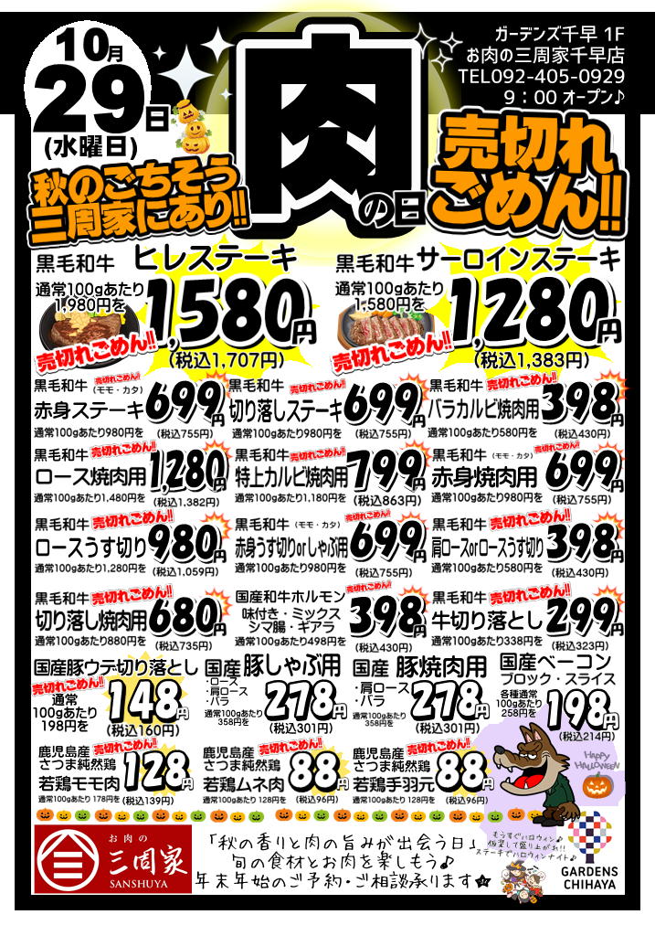 肉の日開催 2025.10.27 NEWS|本館 10月29日(水)は「肉の日」!秋のごちそうは、ぜひ【お肉の三周家 千早店】で! 黒毛和牛ヒレステーキやサーロインステーキなど、極上のお肉が特別価格で登場!焼肉用からすき焼き用、ホルモンまで勢ぞろい。 秋の行楽やハロウィンパーティーにぴったりなお肉を、この機会にどうぞ!売り切れ御免の大特価ですので、お早めにお越しください! ガーデンズ千早1F 朝9:00オープン 投稿ナビゲーション “軽い、強い、美しい”を兼ね備えたチタン素材フレーム「intelligence metal TITAN」メガネブランド「Zoff」から、“軽い、強い、美しい”を兼ね備えたチタン素材フレーム「intelligence metal TITAN」¥9,900から登場