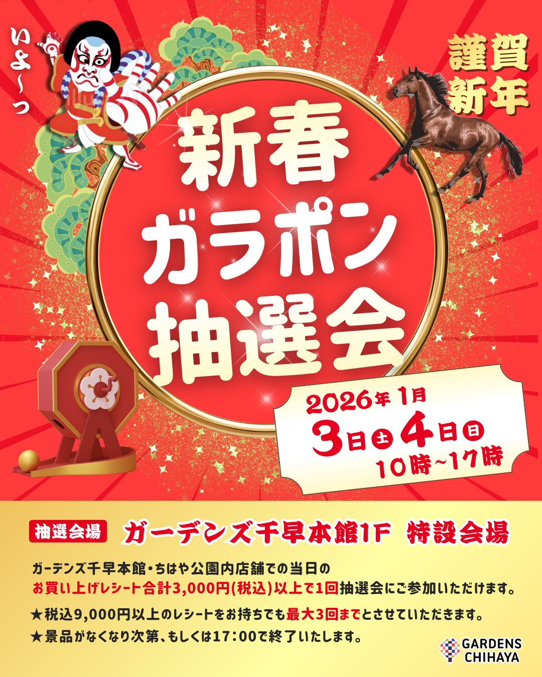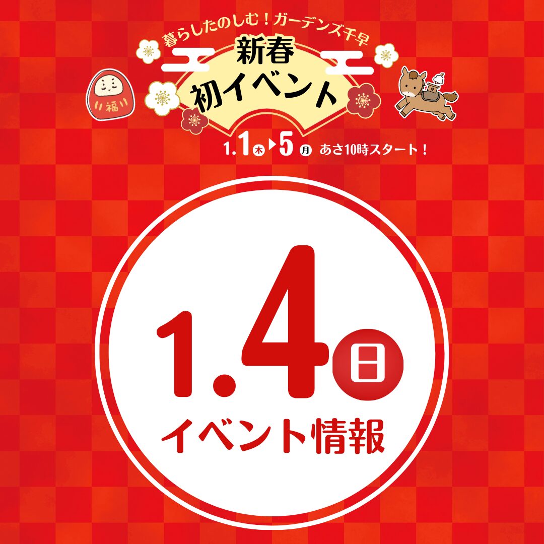 1/4 新春イベント情報 開催日時:2026.1.4(日) 開催場所:/ガーデンズ千早本館1F 特設会場 【新春ガラポン抽選会】当日のお買い上げレシートでガラポン抽選会に参加しよう! ※イベントによって、開催時間が異なります。※イベント内容は都合により変更する場合がございます。あらかじめご了承下さい。 投稿ナビゲーション 1/3 新春イベント情報1/5 新春イベント情報