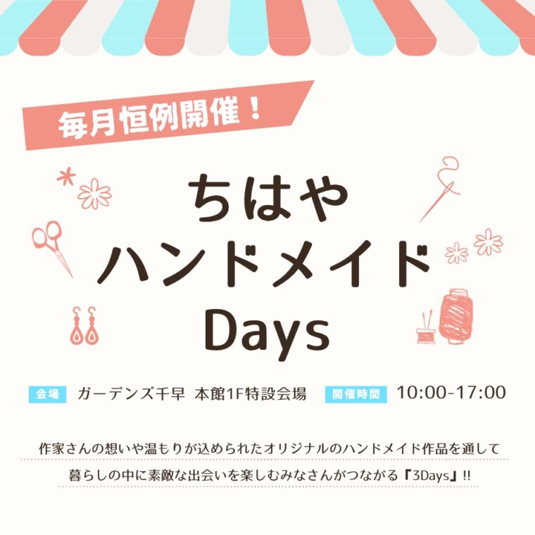 11月ちはやハンドメイドDAYS 2025.11.05 土日祝開催 開催日 11月22日(土)〜24日(月祝)開催時間 10:00~17:00開催場所 ガーデンズ千早本館1F 特設会場 ⚠… More→