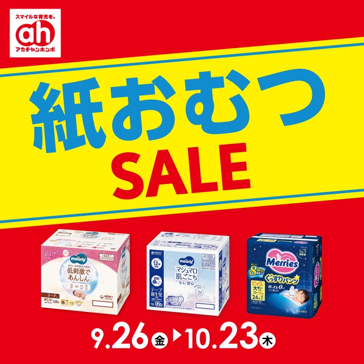 9/26(金)スタート、紙おむつSALEのご案内! ムーニー・ムーニーマンの低刺激であんしんやメリーズのファーストプレミ…
