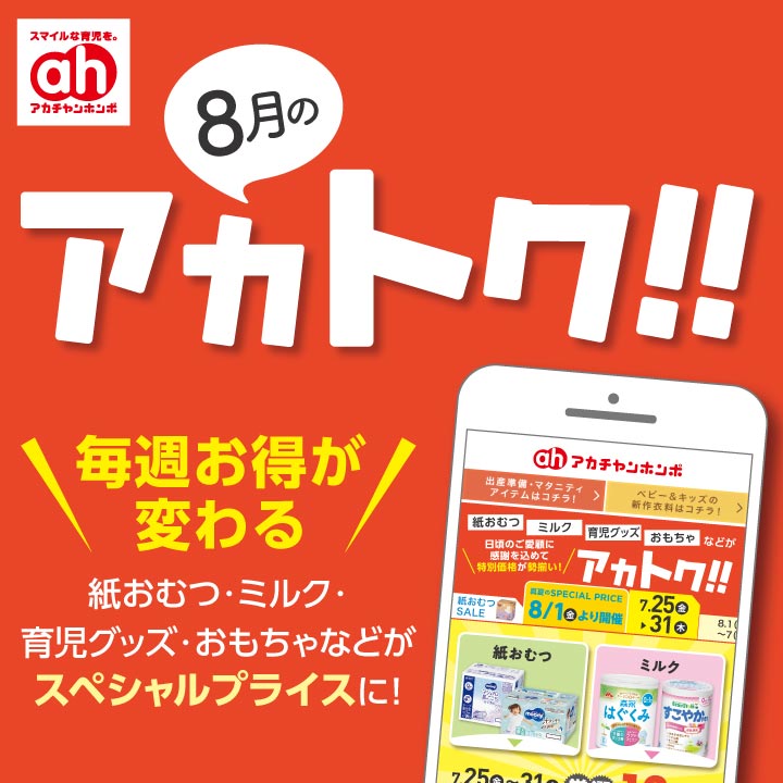 今月のアカトク!!紙おむつ・粉ミルク・おもちゃ・育児雑貨など、週替わりでお買得!