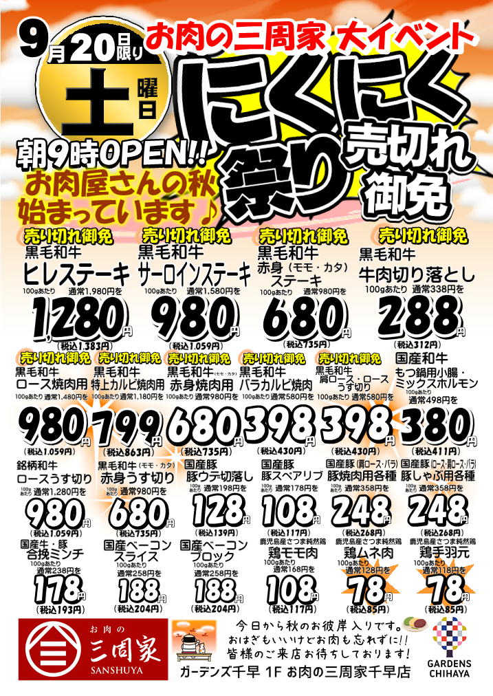 9月20日(土)限定!「お肉の三周家」恒例の『にくにく祭り』を開催します 2025.09.18 NEWS|本館 黒毛和牛ヒレステーキは100gあたり1,280円(税込1,383円)、サーロインステーキは980円(税込1,059円)、赤身ステーキや牛肉切り落としなども大特価! さらにバラカルビ焼肉やしゃぶしゃぶ用ロースも見逃せません。朝9時開店、売り切れ次第終了となりますのでお早めに。 ご家庭の食卓や秋のお彼岸のご馳走にぜひご利用ください。 投稿ナビゲーション 4店舗合同 POP UP SHOP「メガネブランドZoff 秋のGO!GO!キャンペーン」開催!