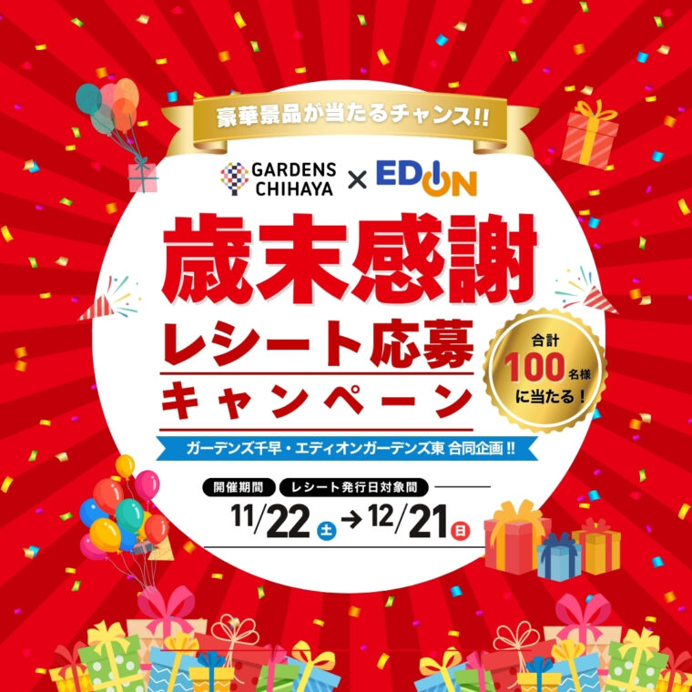 歳末感謝レシート応募キャンペーン 2025.11.22 NEWS|本館|ちはや公園|イースト館 ガーデンズ千早全館(ガーデンズ千早本館・ちはや公園・エディオンガーデンズ千早東)エディオンガーデンズ東店 合同企画歳末感… More→