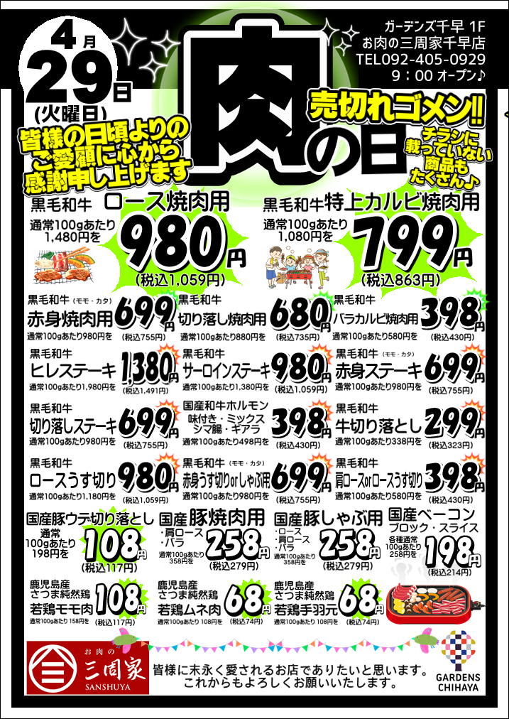 4月29日(火)は【お肉の三周家】で、 肉好きが泣いて喜ぶ “肉の日” 開催中!!