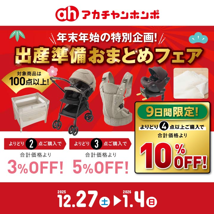 出産準備おまとめフェア 【年末年始】 2025.12.27 NEWS|本館 12/27(土)~1/4(日)の9日間限定! ベビーカー、チャイルドシート、抱っこ紐、ベビーラックなどの対象商品を より… More→