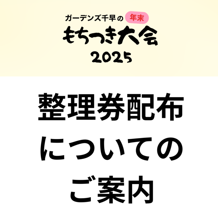 もちつき大会 整理券配布についてのご案内 2025.12.27 NEWS|ちはや公園 12月28日(日)に開催するもちつき大会にてもちつき体験の整理券を当日10時より配布いたします。 イベント会場での混雑・… More→