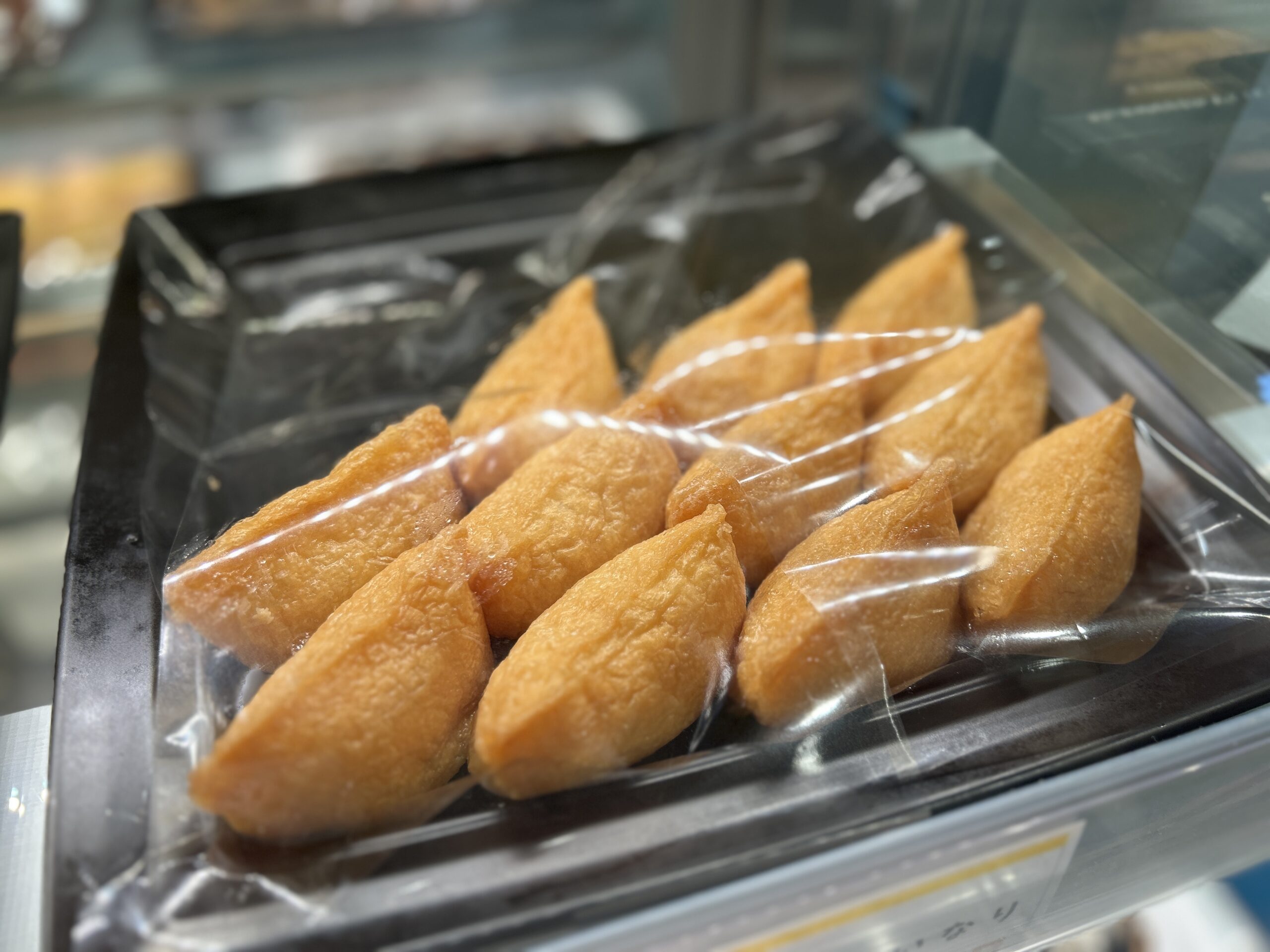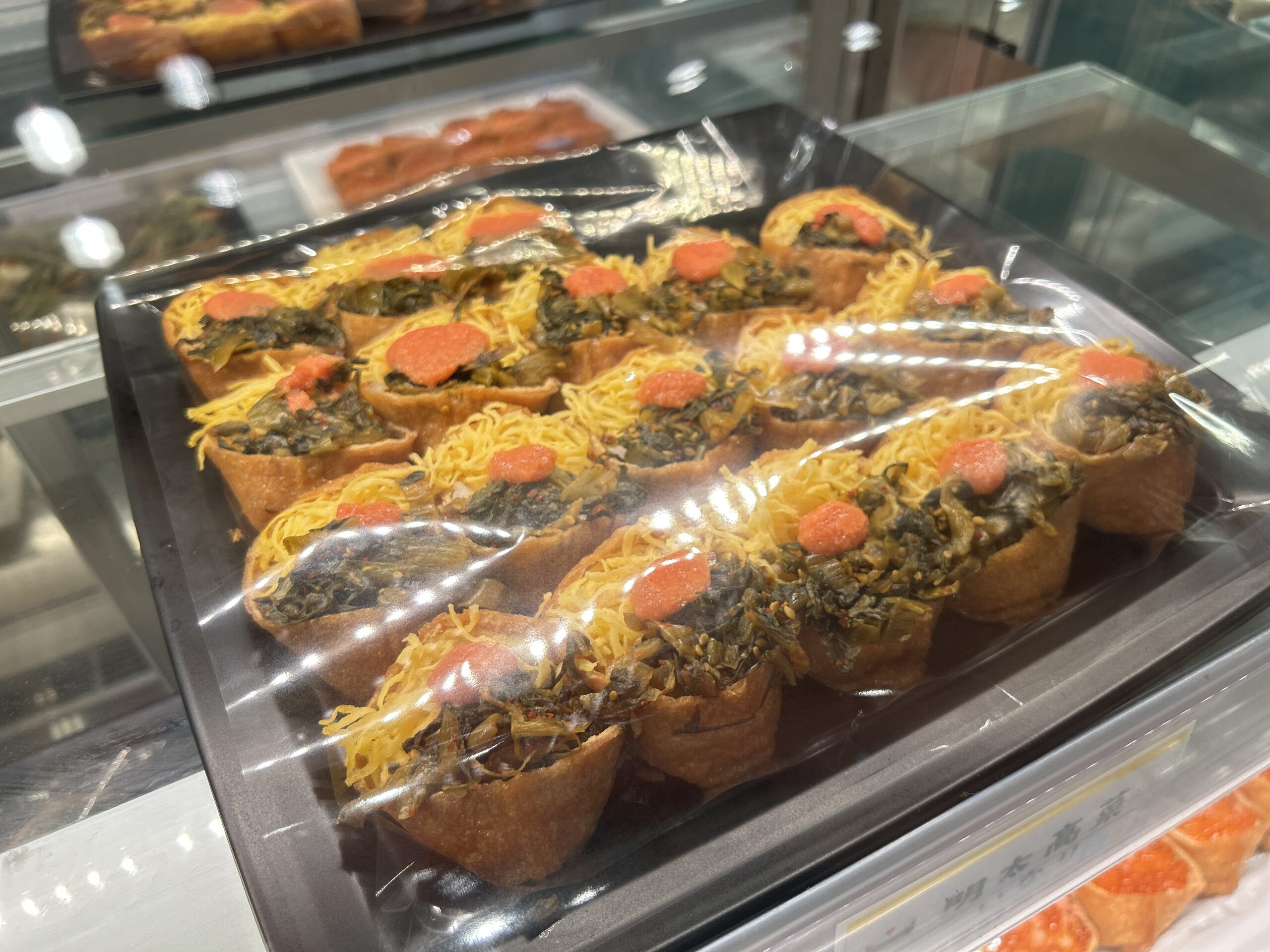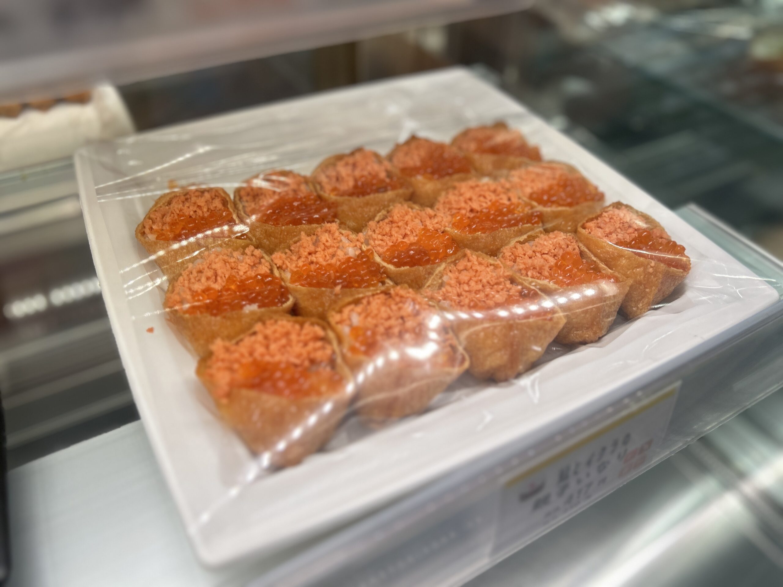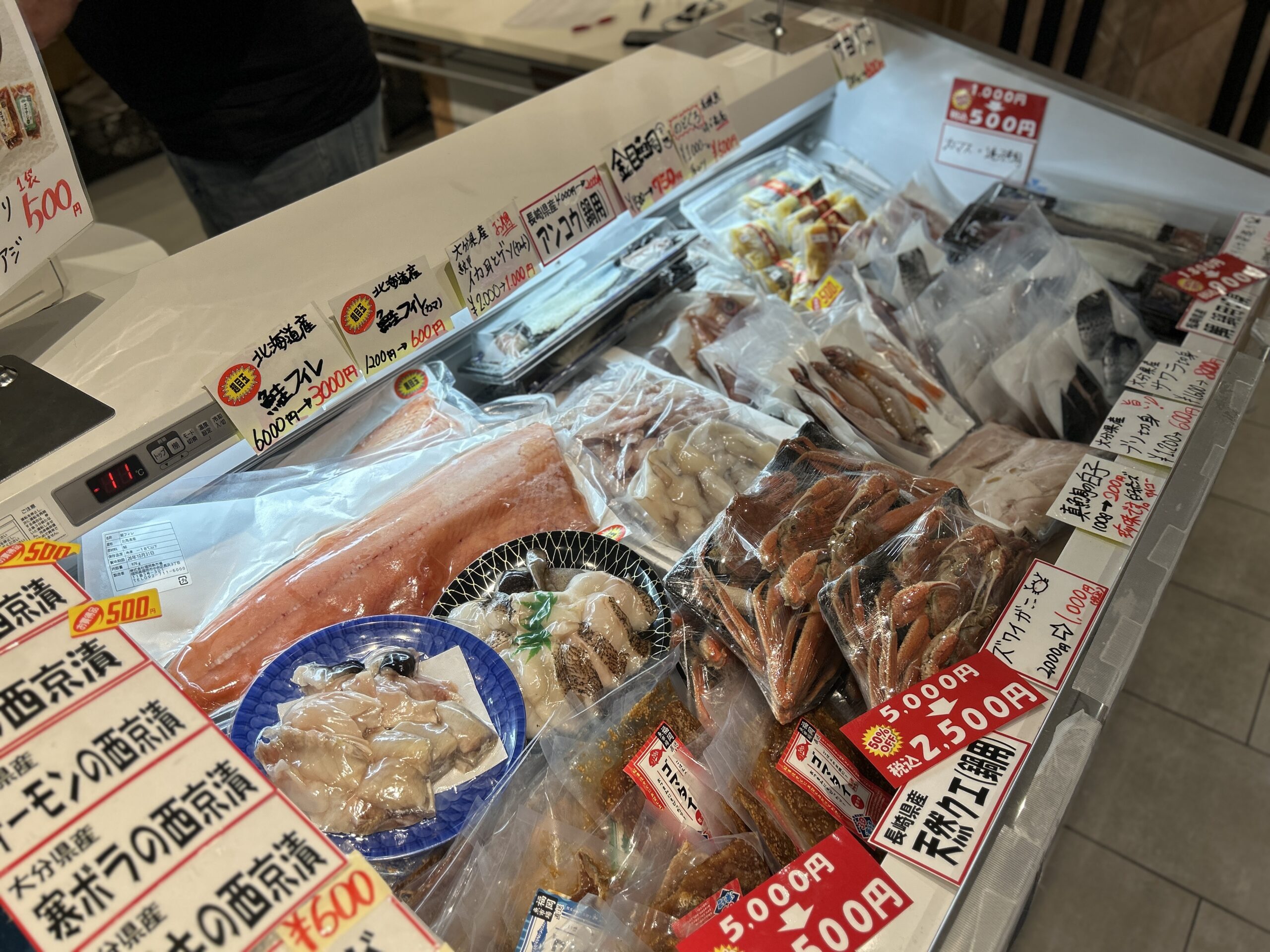 色とりどりの華やかないなり寿司と、長浜市場直送の新鮮な冷凍水産品が勢ぞろい。